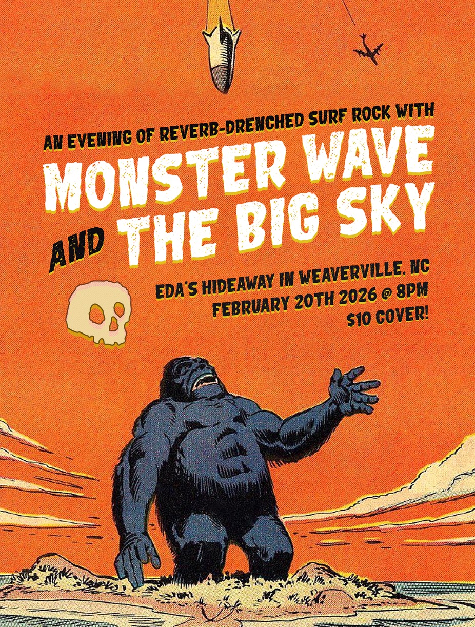 As their name suggests, MONSTER WAVE plays exactly that: an eerie instrumental surf-rock sound that could be the soundtrack for a haunted tiki bar. They have go-go grooves, melodic guitars and a rhythmic beat that will get you twistin' and stompin' into the night! According to Ox-Fanzine, its "as if Dick Dale were setting a few episodes of The Munsters to music". So grab your favorite ghoul and get ready to dance, because remember: sitting still is forbidden! THE BIG SKY is Asheville’s newest instrumental guitar band. Fusing "spaghetti western" vibes with psychedelic surf tunes and Chicago-style post-rock bands like Tortoise and Brokeback, the rock quartet wants every song to sound different than the last. While there is little improvisation, the songs themselves capture the energy and freedom of a live jam, wherein double guitar parts and heavy drums could be mistaken for peak Allman Brothers or Hendrix-style sonic exploration. As AltSceneAVL writes, "The Big Sky is ultimately a feedback loop between squaring the sound and feel of improvisation with composed music.”