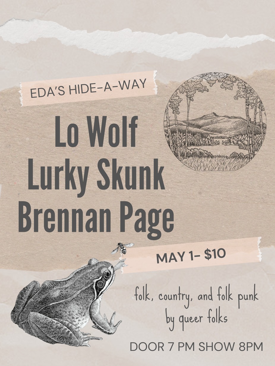 Lo Wolf- Lo Wolf writes music. Authentic folk from the heart, grounded in the present moment. A voice like smoke; songs that whisper and scream. Come along for the ride. Brennan Page- An Appalachian folk musician who will soothe you with their musical landscape, featuring both clawhammer banjo and country inspired guitar. Songs of the land, queer experience, and dreams of the future. Lurky Skunk- A queer folk/anit-folk band consisting of best friends known for their high-energy and tongue twisting performances. They have played extensively in the Southeast, and built a community of skunk fans that bop and sing along.